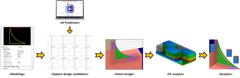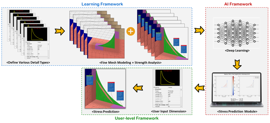 KR has developed an AI prediction model for stress values based on bracket design variables (bracket radius, bracket thickness, and toe height). This model was integrated into KR's flagship software, SeaTrust-HullScan, to explore the potential of AI-CAE. The framework for the AI prediction model, as shown in 'Figure 3', consists of learning data generation, model training, and model utilization.