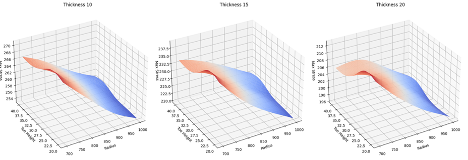 The AI prediction model-based response surface of for ‘Design Variable’-‘Maximum Stress’ as a function of is shown as a 3D graph based on thickness ('Figure 6', ‘Design Variable’-‘Maximum Stress’ Response Surface - X-axis: Toe Height, Y-axis: Radius, Z-axis: Max Stress). The graph shows similar surface shapes for different thicknesses, indicating that both bracket radius and toe height influence the maximum stress, but the bracket radius has a more significant effect. The change in maximum stress appears non-linear in the regions with low bracket radius and toe height. If designing within this non-linear range, it can be very time-consuming due to the difficulty in predicting the design outcome.