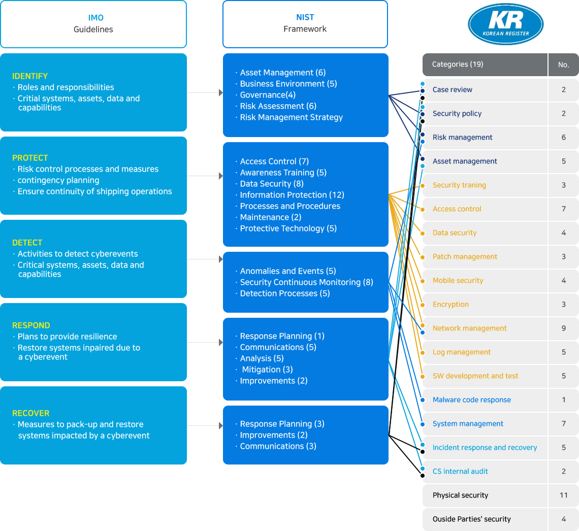 KR 사이버보안 인증 서비스는 고객이 IMO 사이버 리스크 관리에 관한 권고를 이행하도록 지원하기 위해 국제적으로 널리 사용되는 사이버보안 국제표준(ISO 27001, NIST, IEC 62443 등) 뿐 아니라, IMO, BIMCO, DCSA 등 국제 해사업계에서 권고하는 사이버 리스크 관리 프레임워크를 기반으로 설계되었으며, 고객 비즈니스의 사이버 위협을 식별하고, 사이버 리스크 관리를 지원하고 있습니다.