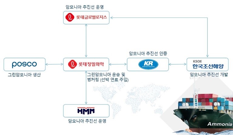 이번 개념 승인을 받은 선박은 한국조선해양이 현대중공업, 현대미포조선과 개발한 6만m3급암모니아 추진 운반선과 3만8천m3급 암모니아 운반/벙커링선 2척으로, 올해 5월 KR를 비롯하여 롯데정밀화학, 한국조선해양, 롯데글로벌로지스, HMM, 포스코 6개 기관이 참여하여‘그린 암모니아 해상운송 컨소시엄’을 발족시킨 후 첫 결실입니다.