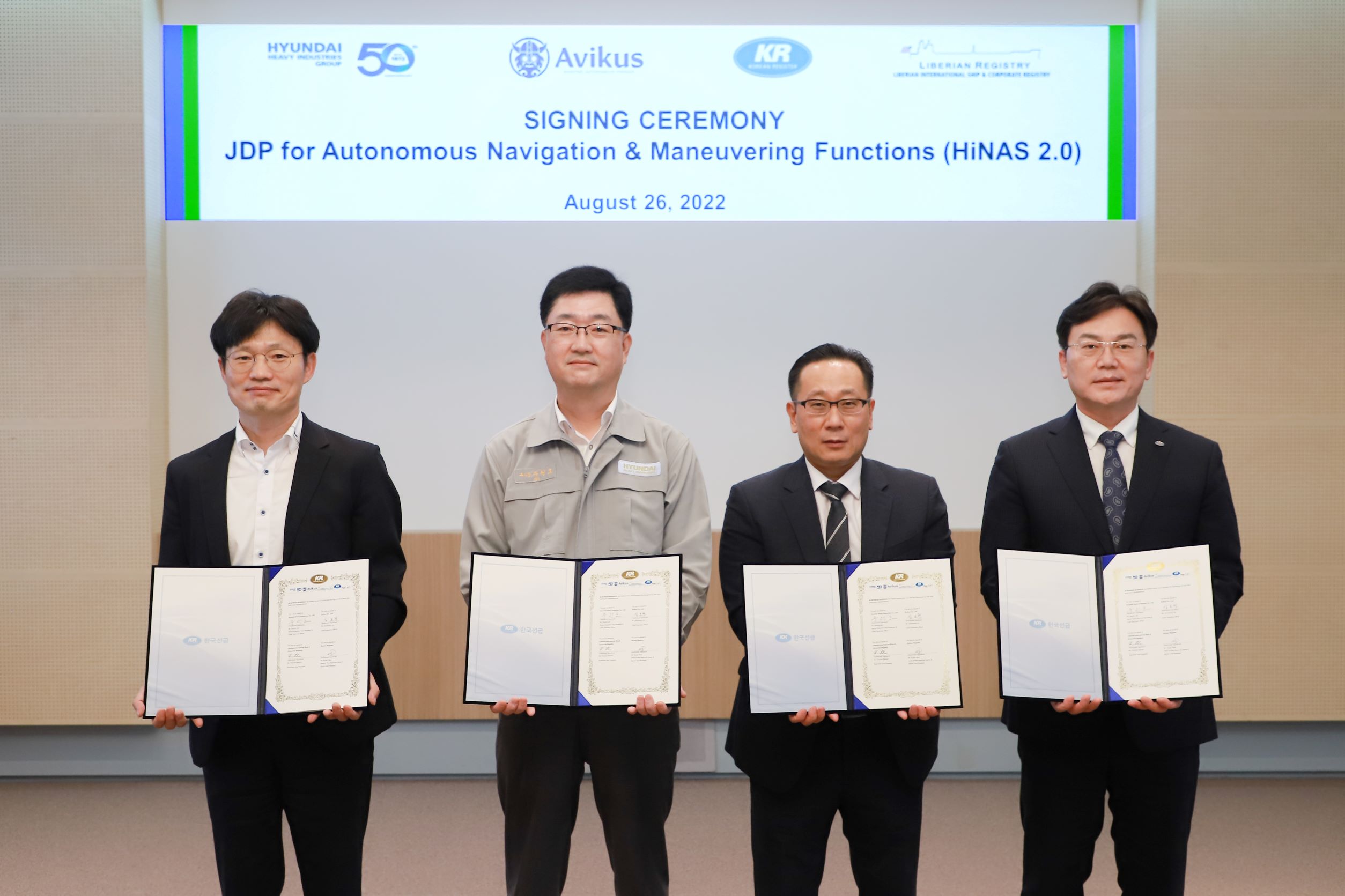 조선소-자율운항전문회사-선급-기국 간 이루어진 이번 공동협약은 자율운항선박 기술력을 토대로 자율 항해 시스템 상용화를 앞당겨 시장을 선점하기 하기 위해 마련됐으며, 이를 위해 아비커스가 개발한 자율 항해 시스템 ‘하이나스(HiNAS) 2.0’을 KR 입급 및 라이베리아 기국 등록 선박에 탑재, 적용을 내년 7월 목표로 하고 있습니다.