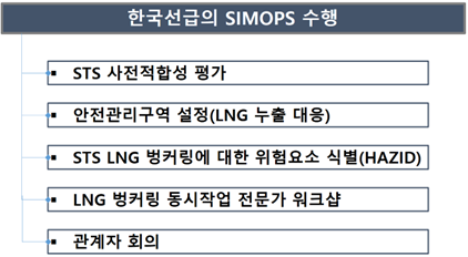 동시작업에 대한 관계자들 사전 회의 및 전문가 워크샵이 수행되고 그 후속조치를 통해 전문가 워크샵을 통해 식별된 위험요소가 허용 가능 수준으로 판명되면 본격적인 LNG벙커링 동시작업을 수행합니다.