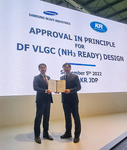 이번 AIP를 받은 대형 가스운반선(VLGC, Very Large Gas Carrier)은 KR과 삼성중공업 간 진행된 공동개발프로젝트(JDP)의 결실로, 암모니아를 운송하면서 암모니아를 추진 연료로도 사용하여 운항 과정에서 탄소를 배출하지 않도록 개발된 친환경 선박입니다.