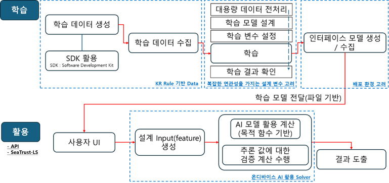 생성된 데이터셋은 전처리 과정을 거쳐 모델 학습에 사용되었으며, 복잡한 연관성을 가지는 설계 변수를 충분히 반영할 수 있도록 데이터의 다양성을 확보하였습니다. 또한 개발된 AI 모델은 배포 가능한 형태로 개발하였으며, 최종적으로 SeaTrust-LS 소프트웨어의 내부 기능으로 통합되어 시험 가동될 수 있도록, 사용자가 쉽게 활용할 수 있는 형태(API)로 구현되었습니다.
