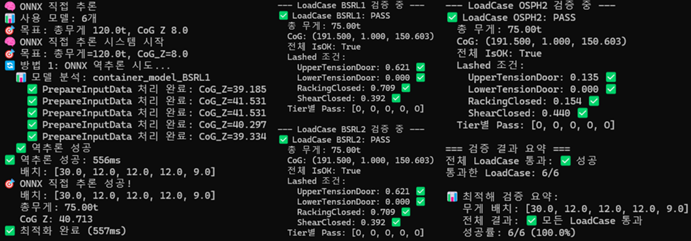 또한 AI 모델을 활용하여 여러 후보 적재안을 신속히 생성한 뒤, 각각에 대해 기존 해석 소프트웨어로 검증 계산을 수행한 결과, AI가 제시한 배치안들이 구조적 안전성 및 복원성 기준을 만족함을 확인하였습니다. 특히 AI 모델은 수 초 내에 수십~수백 개의 배치 시나리오를 평가하여 최적안을 추천할 수 있으므로, 대량의 해석으로 수 시간 소요되던 작업을 획기적으로 단축할 수 있었습니다. 이를 통해 본 기술을 현장에 적용하면 상당한 시간 절약과 운영 효율 향상이 가능함을 검증하였습니다.